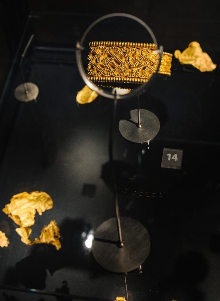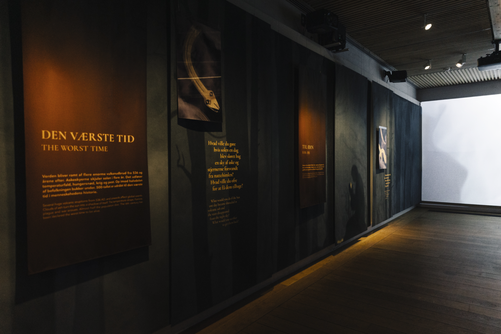 This exhibtion tells the story of The Gold Treasure from Vindelev, a significant treasure that was found in Denmark in 2020 and the 23 pieces of gold that were hidden for 1,500 years are displayed. The story is transformed into a sensory narrative with light, sound and audiovisual sequences.
